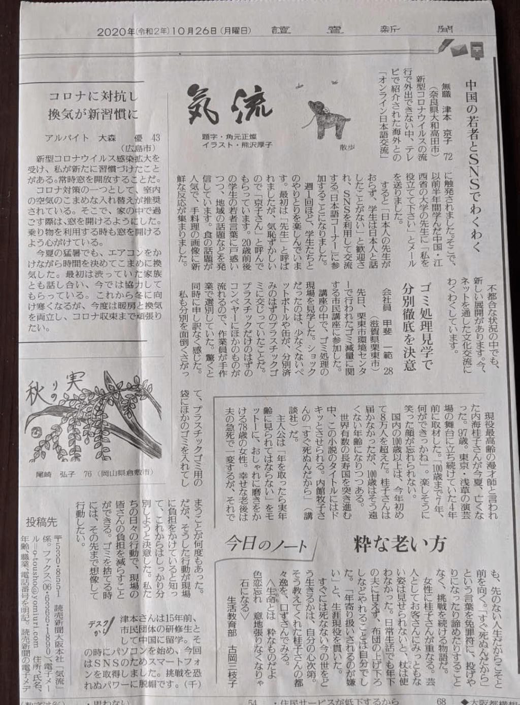 近日,免费为我校学生线上日语角进行教学的外教津本京子的文章登上了日本三大报纸之一的《读卖新闻》。她将疫情期间与我校外国语学院日语师生进行线上教学交流的心得写进了文章,引起了媒体和社会的关注。