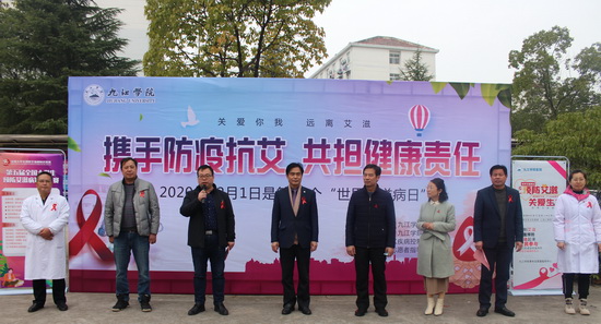12月1日是第33个“世界艾滋病日”,由校医院、校团委联合濂溪区疾控制中心、学生唯医服务队在学校三食堂前的广场举行“世界艾滋病日”宣传教育系列活动。副校长杨耀防,九江市疾控中心党委书记唐亚平、副主任熊飞宇,濂溪区疾控中心主任邵卫兵、九江学院校团委、校医院负责人以及濂溪区疾控中心、校医院相关人员、学生唯医服务队等共计400余人参加了此次活动。