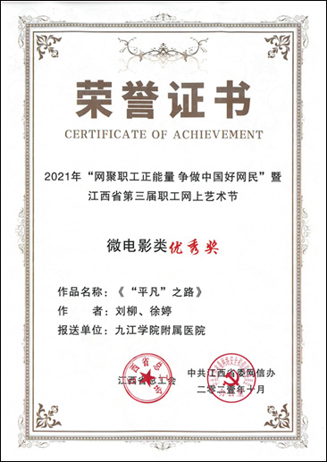 近日,2021年度“网聚职工正能量 争做中国好网民”暨江西省第三届职工网上艺术节作品征集活动评选结果揭晓。九江学院附属医院选送的由神经内科刘柳、徐婷制作的微电影《“平凡”之路》作品荣获微电影类优秀奖。