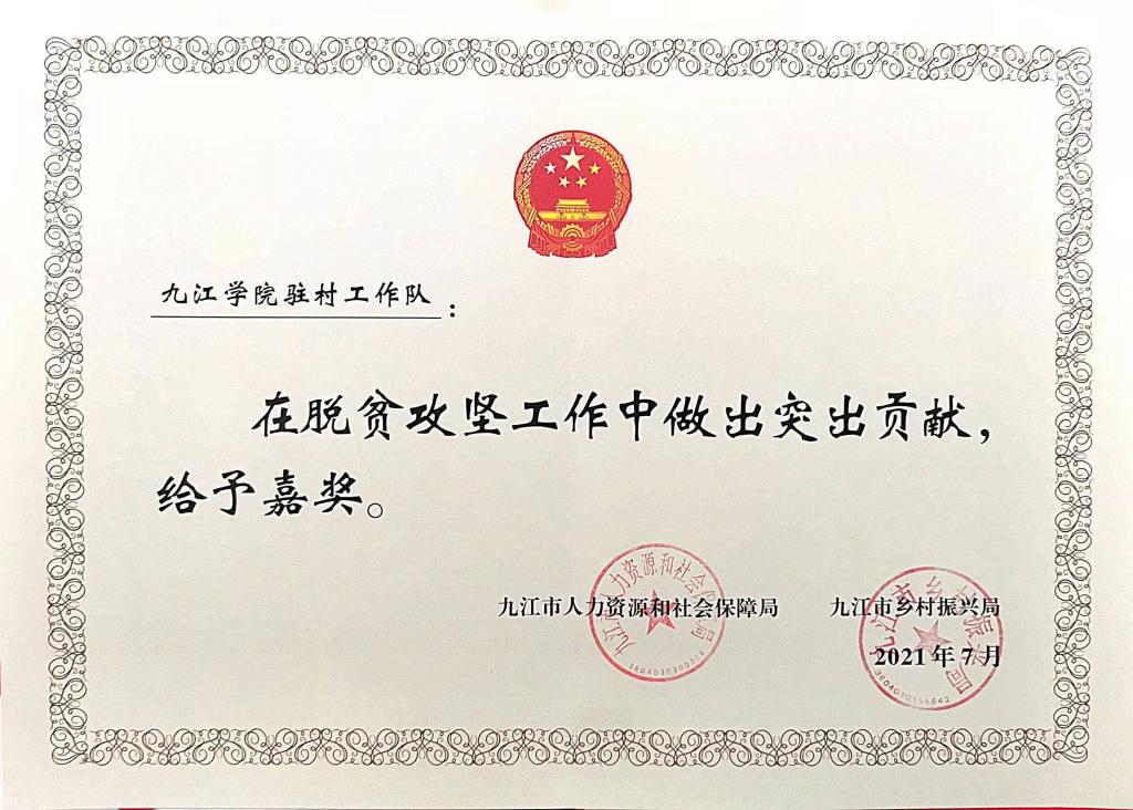 近日,从九江市人力资源和社会保障局、九江市乡村振兴局《关于给予九江市高级技工学校等3个集体、汤高峰等36名同志记功和九江市房地产公司等36个集体、吴寰等170名同志嘉奖奖励的决定》文件获悉,我校脱贫攻坚驻村工作队荣获市事业单位脱贫攻坚专项奖励集体嘉奖。