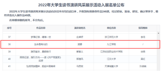 2022年大学生读书演讲风采展示活动 自2022年5月活动启动以来,共收到有效推荐作品246部。经过初审、复审、研议、确认等环节,最终评选出入展作品49部。我校医学院凌娜同学的演讲作品《生命是有光的》成功入展。