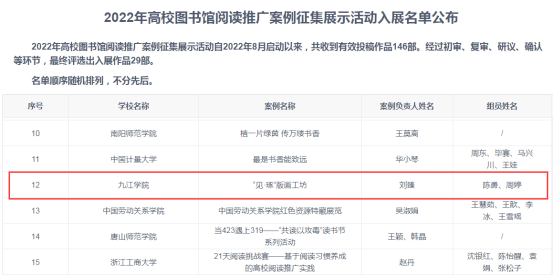 近日,由中国图书馆学会主办的多项阅读推广活动落下帷幕,在校图书馆的积极组织下,九江学院师生踊跃参与,并喜获佳绩。