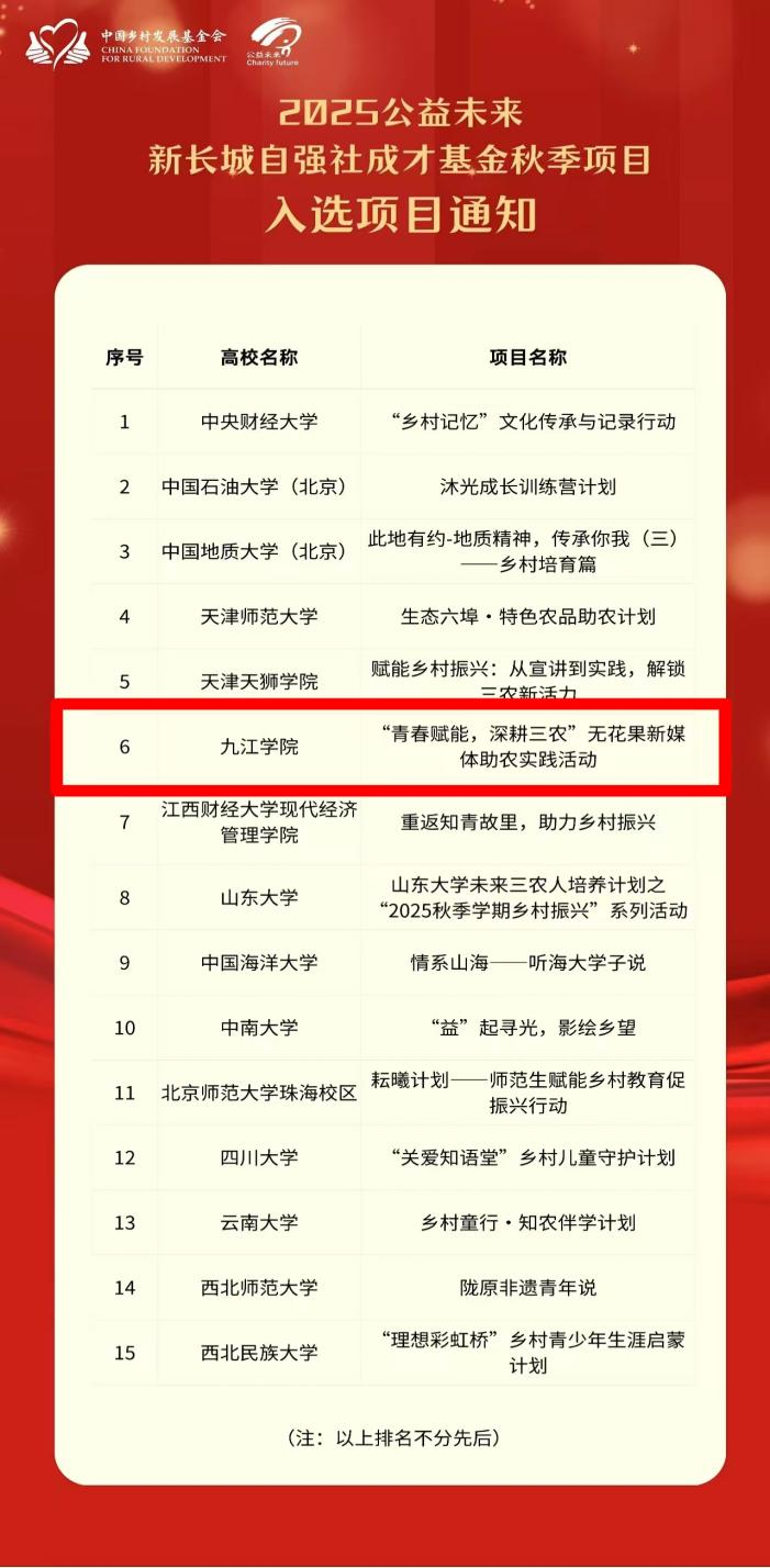 近日,2025年度公益未来·新长城自强社成才基金秋季项目评审圆满落幕。在学生工作处(学生资助管理中心)的指导下,由我校自强社申报的“青春赋能,深耕三农”无花果新媒体助农实践项目,凭借其创新的模式、明确的助农目标和周密的实施计划,在众多高校中崭露头角,荣获全国15强的佳绩。