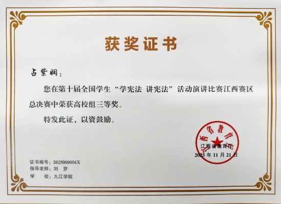 近日,江西省教育厅主办的第十届全国学生“学宪法 讲宪法”活动江西赛区总决赛圆满落幕。九江学院代表队在赛事中脱颖而出,法学院学生童可欣、占紫娴在法治素养竞赛和演讲比赛中分别斩获高校组三等奖,以双奖佳绩彰显新时代青年法治素养。