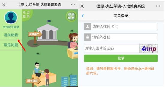 依次点击“开始闯关”“点击登录”“点击新生登录”图标,进入“闯关登录”页面。闯关登录,输入校园卡号和密码(密码格式:“@Jju+身份证后六位”)。