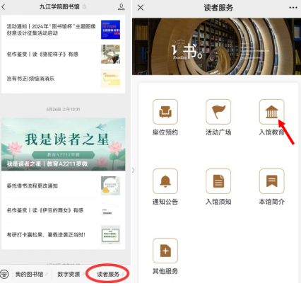关注“九江学院图书馆”微信公众号(账号“jjxy_tsg”),点击右下角“读者服务——入馆教育”进入游戏闯关页面。