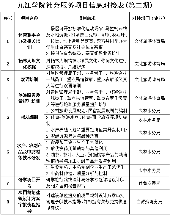 为贯彻落实《九江学院服务九江经济社会发展三年行动计划(2024-2026)》(九院党字〔2024〕66号)文件要求,通过科技服务领军团对庐山西海风景名胜区经济社会发展相关需求进行征集,确定以下8项为第二期社会服务项目,现面向全校发布项目信息。