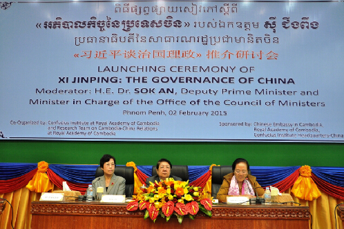 2月2日,由中国驻柬埔寨大使馆、孔子学院总部、柬埔寨王家研究院共同主办、柬埔寨王家研究院孔子学院具体承办的“《习近平谈治国理政》推介研讨会”在柬埔寨总理府友谊大厦举行。柬埔寨副首相兼内阁办公厅大臣索安(Sok An)、中国驻柬埔寨大使布建国、柬埔寨王家研究院院长克罗提达(Kholt Thyda)、人民出版社社长黄书元、柬埔寨王家研究院孔子学院院长谢莫尼勒(Chea Munyrith)、中方院长帅式毅、中国现代国际关系研究院院长特别助理杜彦钧、九江学院专家汪红梅、云南省新知集团董事长李勇、东南亚电信柬埔寨总经理韩汉畴等出席了研讨会。来自柬埔寨王家行政学院省长培训班的200名学员、政府、议会、高校、媒体、智库等共1200余名各界人士参加。