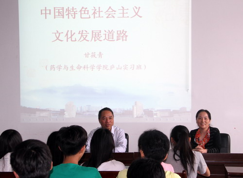 5月17日下午,甘筱青校长来到庐山实习培训基地,看望了正在庐山见习药学与生命科学学院学生,并且给学生做了主题为《中国特色社会主义文化发展道路》的报告,报告会由药学与生命科学学院党委书记严姣姣主持。