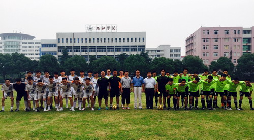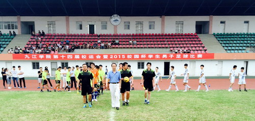 5月25日下午,九江学院第十四届校运会暨2015校园杯男子足球比赛在主校区南区足球场顺利拉开帷幕。副校长陶春元与学生处、校团委、体育学院相关负责人以及参赛球队领队出席了开赛仪式。