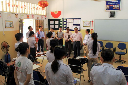吴健民在座谈中,向大家仔细询问了柬埔寨学生学习汉语的原因、动力以及汉语的发展前景等问题。肖荣向代表团介绍了孔子课堂的近期有关工作情况及各位教师的有关情况。接着,大家就柬埔寨汉语教育发展的情况进行了讨论,各位教师从本地华裔家庭的汉语传承以及汉语在求职就业方面所带来的机遇等方面做了详细回答。