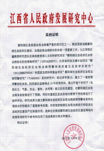 我校基础医学院汪鑫教授研究团队在承担教育部人文社科研究项目“鄱阳湖生态经济区血吸虫病综合防控策略研究”、江西省科技支撑计划项目“鄱阳湖生态经济区血吸虫病预警体系的建立及其评价研究”和国家自然科学基金项目“鄱阳湖生态经济区血吸虫病预警研究”系列研究中,经过多年努力,建立了一套疫情预警指标体系,研究成果为建立鄱阳湖生态经济区血吸虫病疫情预警体系和加强综合防控提供了重要参考依据,相关研究成果已被江西省人民政府发展研究中心采纳。