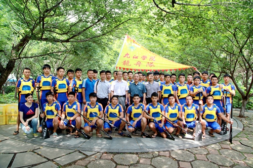 甘筱青校长在表演赛上致辞。他指出,划龙舟迎端午是中国人的一项传统活动,也是我们学校一项特色体育项目,同学们在刚刚结束的亚洲大学生龙舟锦标赛中又取得了两银一铜的好成绩,我代表学校向大家表示祝贺!这也是同学们在端午节到来之际为学校献上的一份厚礼!甘筱青还勉励校龙舟队在今后的比赛中再创佳绩,为学校争光。并向全校广大师生、九江市人民表示节日的祝福——祝大家端午节快乐!
