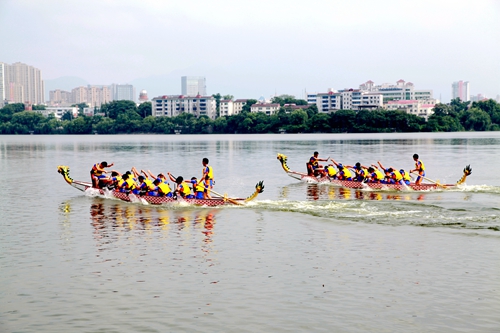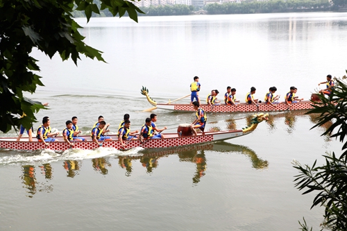 6月19日下午2时58分,学校两支龙舟队来到浔阳城美丽的南门湖畔,举行庆端午龙舟表演活动。队员们身着整齐的比赛服,个个精神抖擞,做好了赛前的各项准备工作。甘筱青校长出席活动并作讲话,副校长陶春元,宣传部、体育学院、八里湖校区管理办公室负责人,以及教练员、媒体记者和部分市民参加了活动。