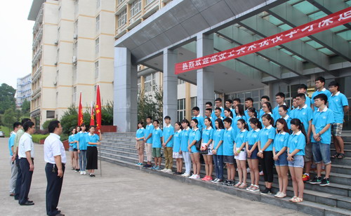 6月28日上午,我校2015年暑期三下乡社会实践活动出征仪式在厚德楼门口举行。副校长王万山出席出征仪式并为服务队授旗。学生处处长刘平、校团委书记闫来英和来自三个校区的42名师生参加了出征仪式。