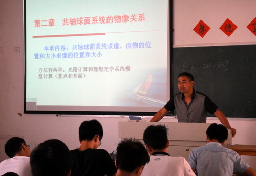 课堂上,徐高平老师通过多媒体动画手段,形象生动的揭示了在共轴球面系统的物像关系。讲授过程中,徐高平老师不时与同学们交流互动,引导启发同学们对新知识的理解和掌握。吴副校长在课堂上听的聚精会神,认真做着笔记。