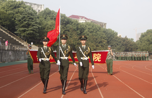 庐山区人民武装部副部长、军训旅旅长戴中付及海军后勤部队干事、军训旅第四团团长陈巍和学生处处长、军训旅政委刘平及浔东校区管理办副主任、军训旅第四团政委周学英分别宣布本次军训会操和内务评比结果。校领导和九江军分区领导为获奖班级颁发了锦旗。