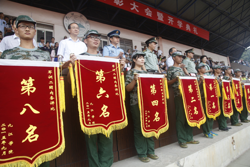 在同学们的热烈掌声中,2015级新生军训总结表彰大会暨开学典礼结束。至此,为期9天的军训圆满落下帷幕,也拉开了2015级新生新学期的序幕。在九江学院这片承载着梦想与希望的热土上,2015级新生一定能秉承“竞知向学,厚德笃行”的校训,迎接充满挑战和机遇的大学时代!