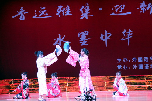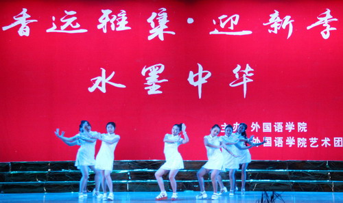 迎新晚会在香远雅集艺术团开场舞中拉开了序幕,主持人用中、英、日三种语言介绍了晚会,充分展现了外国语学院的专业特色。整场晚会围绕葱茏九院、水墨中华、炫彩世界三大主线展开,分别从不同角度展现了外院学子的风采。