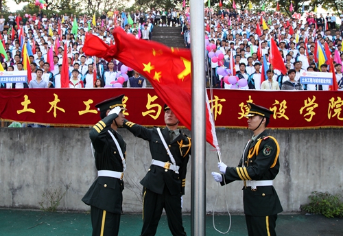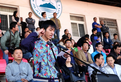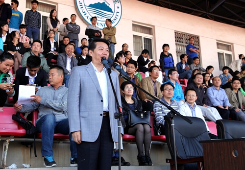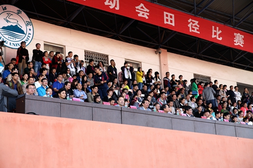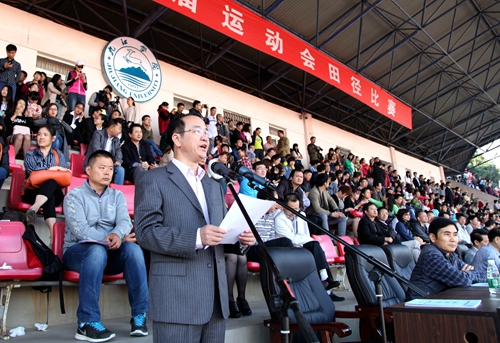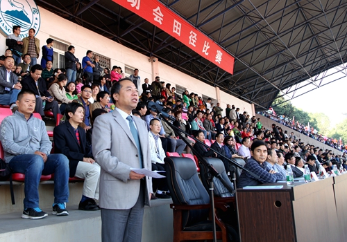 甘校长在致辞中希望全体运动员尊重裁判,尊重对手,顽强拼搏,奋勇争先,赛出风格;希望全体裁判员,工作人员坚守岗位,严守流程,热情工作,公正裁判;希望同学们讲文明,守纪律,服从管理。甘校长最后预祝第十四届校运会取得圆满成功。