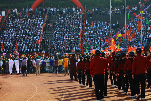 上午8点,场内所有人员注视田径场中心,护国旗队、护校旗队、护会旗队、护会徽队伴随着铿锵有力、激昂奋进的运动员进行曲依次入场。他们英姿飒爽,他们意气风发,他们代表了九院学子对此次运动会的关注与热情。鲜艳的五星红旗在初秋的晨风中鲜艳夺目,校旗、会旗和会徽交相辉映,庄严、神圣。紧随其后的管乐队、鲜花队、彩旗队彰显了我校学子的青春风采,裁判员代表队整齐的步伐彰显了他们严谨、公正的执法风格。
