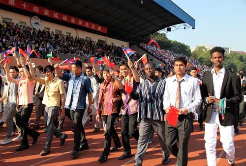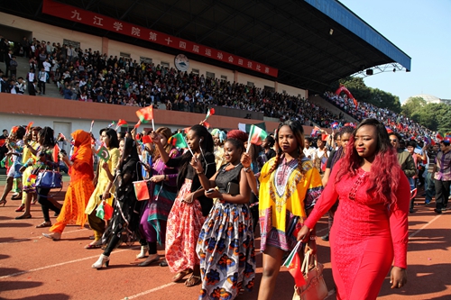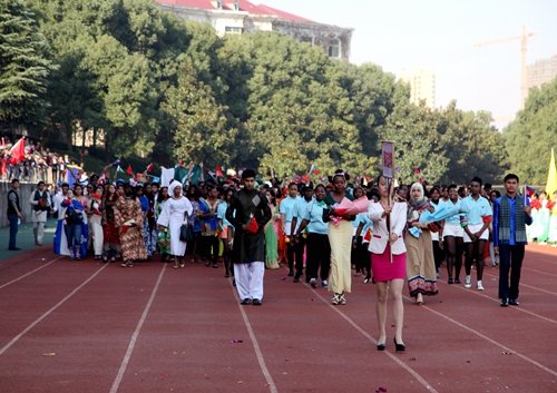 国际交流学院的留学生代表队他们身着亮丽的民族服饰,手捧鲜花,顺着跑道向大家走来,并伴着欢快音乐跳起特色的舞蹈,总会成为全场的一道亮丽的风景线。