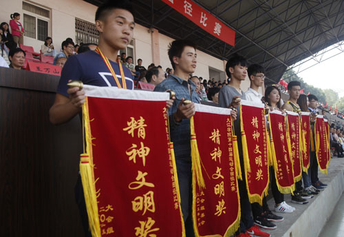 经过两天半紧张、激烈、精彩的角逐,在圆满完成了全部比赛项目后,10月17日上午,九江学院第十四届田径运动会在此起彼伏的欢腾声、呐喊声、助威声中胜利闭幕。在家校领导甘筱青、吴桃娥、纪岗昌、王万山、陶春元、杨焱林、魏立平、杨耀防出席了闭幕式并为获得精神文明奖、团体总分奖的单位颁奖。闭幕式由副校长王万山主持。