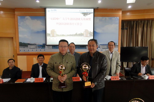 会上,实验中心主任方向明宣读了《九江学院关于公布“互联网+”大学生创新创业大赛校园赛获奖名单的通知》。经个人申报,二级学院推荐,学校组织专家评审,评选出一等奖6个,二等奖10个,三等奖12个,优秀组织奖3个。甘校长、陶副校长和在主席台就座的领导小组办公室负责人向获奖二级学院代表颁发了奖杯和奖牌。
