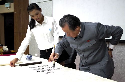 讲座结束后,同学们还围拢在梅先生身边请教,近距离欣赏他的书法作品。大家纷纷表示梅先生年近古稀,宣传红色文化的劲头值得年轻人学习,此次讲座不仅是一次文化艺术大餐,也是一堂生动的爱国主义教育课。青年学生一定会写好中国字,做好中国人,践行中国梦。