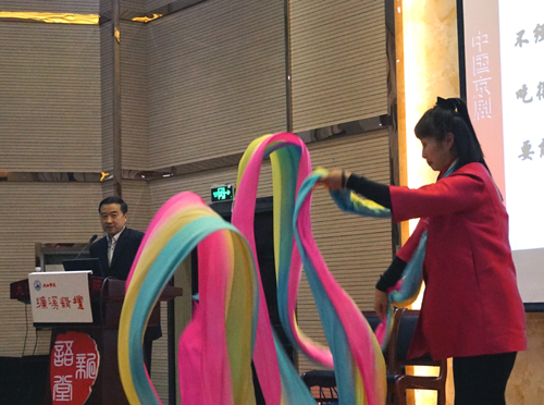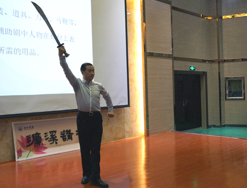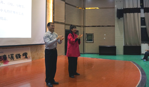 4月11日晚,京剧名家孙萍、叶金森做客我校第145期濂溪讲坛,在香远楼三楼报告厅为我校师生带来了题为“京剧艺术的台上与台下——国粹的传承与发展”的精彩讲座。校党委书记郑翔,副校长杨耀防及党委宣传部、学生处、校团委、艺术学院、外语学院、继续教育学院等部门负责人与广大师生们一起聆听了讲座。讲座由副校长杨耀防主持。