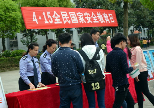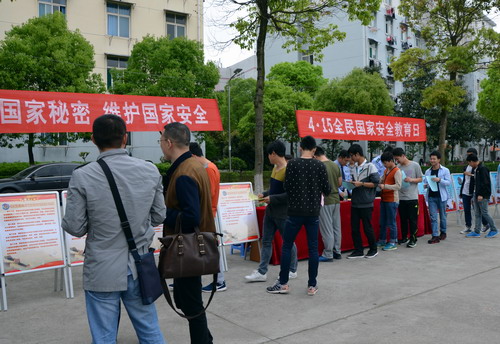 为提高我校师生的国家安全意识,使我校师生谨记维护国家安全的重要意义,在首个全民国家安全教育日到来之际,4月15日上午,学校保卫处、学生处协同九江市国家安全局在我校三食堂广场举办了以“保护国家秘密,维护国家安全”为主题的“国家安全教育日”宣传活动。