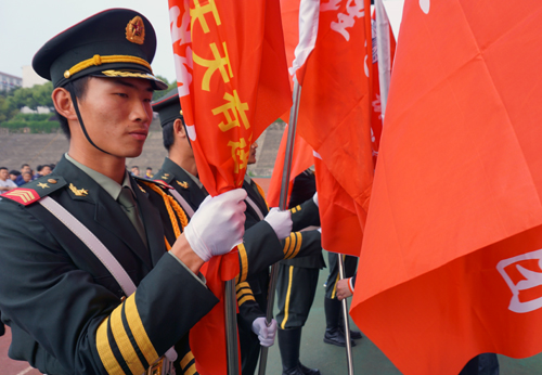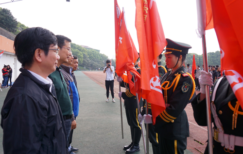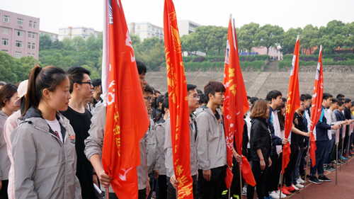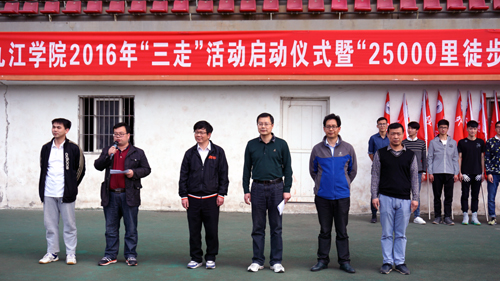 启动仪式上,举行了“出征”授旗仪式。副校长王万山宣布——九江学院2016年三走活动启动暨两万五千里徒步长征正式出征!