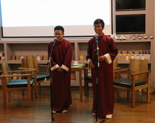 在节目的第二环节“扬帆起航”中,李丁的大学同学也来到了节目现场,为同学们爆料了一些在大学时期李丁台前幕后的生活与学习情况,激发了在场同学们的强烈好奇心,将节目引入了又一个高潮。第二环节的提问中,李丁学长畅聊了毕业后的军旅生涯以及走上相声舞台的酸甜苦辣,他很好的用自身的经历诠释了就业过程中的坚持与梦想。伴随着李丁对母校以及对学弟学妹的真情寄语,活动接近尾声。