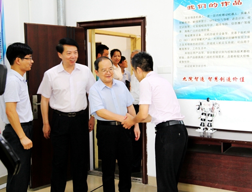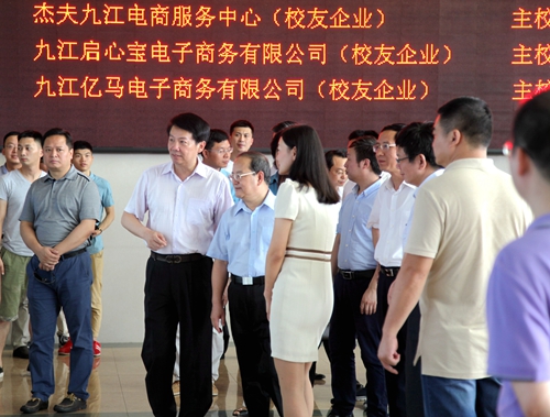在九江乐智高机器人科技有限公司,鹿心社省长听取了公司负责人张广顺老师的介绍,询问这些机器人产品是不是他们自己动手做的,当听说这些机器人产品都是师生动手做的时,鹿省长称赞这些产品“做得挺好的”。在九江沃策科技有限公司,鹿省长听说这家公司有许多在校学生在创业时,与同学们一一握手,询问他们读几年级,学什么专业。对他们在校时就能结合所学知识进行创业实践表示赞赏。在飞天县域电商研究院,鹿心社省长认真听取了刘鹏飞对企业的介绍,询问他公司运转情况、员工总数和产品类型,听到他在短短八年时间取得那么大的成绩时,赞扬刘鹏飞是“九江学院大学生创业成功的典范”。在如燕贸易有限公司,当听说公司负责人刘伯是淘宝大王,公司光阿里巴巴承认的“淘字号”淘宝店铺就有5个,年销售额超过数亿元时,鹿心社省长十分开心。在葫芦娃网络安全认证研发中心参观考察时,听说该公司是中国领先的互联网安全认证及电子商务服务提供商时,鹿心社省长对他们取得的成绩给予了充分肯定。