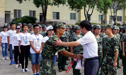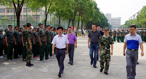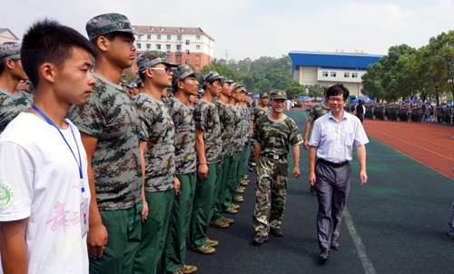 9月12日上午,副校长王万山在军训旅旅长、武警九江支队教导大队教导员张鹤、学生处处长刘平、团委书记闫来英、学生处副处长郭青等的陪同下,到军训场地看望2016级军训新生。