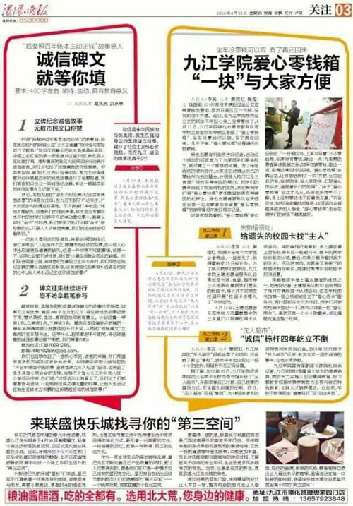 诚信之壤,厚植校园。在这片厚土之上,绽放了以“无人超市”为代表的系列诚信品牌之花。2012年9月,我校政法学院大三学生李至勋和同学利用学校给予的勤工俭学政策,在校图书馆一楼的勤工俭学服务点开起了一家“无人售货超市”。超市内商品有饮料、小吃和文具用品等,师生在选购商品后,只需按照价签直接将钱放入“收银盒”内,也可以自助找零;在找不开零钱或者没带钱的情况下,师生还可以赊欠。此事被中央电视台新闻频道和《人民日报》等数十家电子和纸质媒体纷纷转载和评论,赞誉满满。