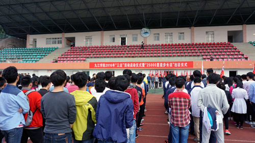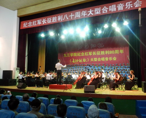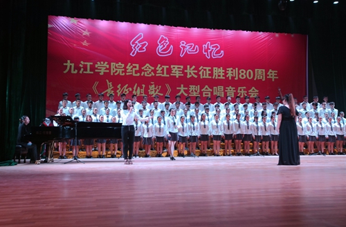 在九江学院第十五届田径运动会开幕式上,除了由二级学院各具特色的方阵代表队伍各展其长、演绎鲜明的活动以外,与以往不同的是,开幕式上三支学生代表队和一支教职工代表队为在场师生演唱《长征组歌》,激昂高亢的歌声撼动全场,娴熟的指挥、专业的伴奏,激昂的歌声,动人的表演,深情地表达了内心的情感,赢得了在场近万名师生的掌声和欢呼。这是九江学院党委以育人为宗旨,结合“两学一做”学习教育,深入学习党的十八届六中全会精神,传承红色基因,弘扬长征精神,并不断赋予其新时代内涵的重大举措。