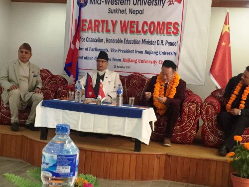 在中西部大学访问期间,杨焱林副校长向尼方介绍了九江学院、九江学院附属医院以及九江学院在柬埔寨和美国创办的孔子学院的情况,中西部大学乌朋达(Upendra)校长对我校代表团的来访表示热烈的欢迎。双方共同探讨了在尼泊尔合作申请创办孔子学院和医学院的可能性。在充分交流后,杨焱林副校长代表九江学院与中西部大学签订了合作备忘录,两校决定在学术交流、师生交流、合作项目等多方面开展广泛的合作,尼泊尔教育部部长出席了备忘录签署仪式。