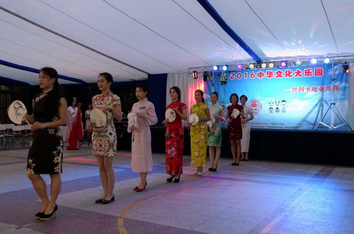 随后,江西教师代表团的各位教师依次给大家带来了武术、舞蹈、书画、剪纸、琵琶弹奏、豫剧、魔术表演、古诗吟诵、茶艺和集体歌伴舞等形式多样、内容丰富的演出节目,给大家呈现了一场高雅的中国传统文化魅力的视听盛宴,其中既有身手不凡的武术表演,巾帼不让须眉的风采展现的淋漓尽致;也有婀娜灵动的民族舞蹈表演、把江南女子的柔美娇羞呈现的惟妙惟肖;还有精彩的书画剪纸和琵琶弹奏合演,让大家在短时间内一睹了中国古典琴棋书画艺术的高雅情趣及魅力;一个个神奇的魔术表演让场下的观众们连连称赞;一曲《霓裳古韵》吟诵及旗袍秀展示仿佛带大家穿越到了“青青子衿,悠悠我心”的古风年代,各位女教师成员身着古典旗袍,手持蒲扇,吟吟细语,把中国女性特有的柔美和端庄展现的异常生动;最后一曲集体歌伴舞《爱我中华》把全场气氛拉向高潮,教师们纷纷把台下的观众请上舞台一起踏着欢快的旋律跃动起来,这种互动顿时带动了全场,现场一片喜气祥和。