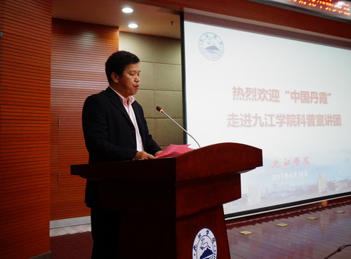 我校副校长陈春生致辞,他说,今天我校迎来了广东丹霞山和中山大学的各位嘉宾,共同举办“中国丹霞”走进九江学院科普讲座活动,在此我谨代表全校师生向莅临九江学院的领导、专家学者表示热烈的欢迎和诚挚的谢意。临近世界地球日,“中国丹霞”走进九江学院,共话江山多娇,共叙赣粤之情。衷心希望各位领导和专家对我校教学科研工作多提宝贵意见和建议,对各位专家来九江学院传道授业解惑表示感谢,并祝本次活动取得圆满成功。