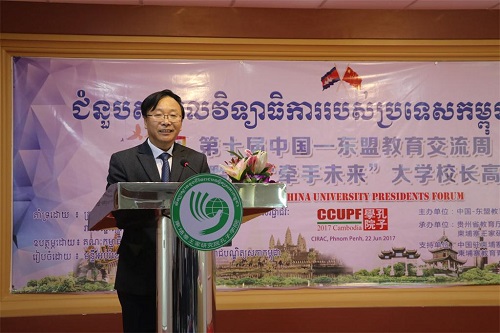 贵州省教育厅厅长王凤友先生致辞,他说,贵州在山水风光、民族文化、特色风物以及人文教育方面有着独特的优势,希望通过此次活动,在黔柬两地大学之间搭建新的平台,推动双方开展优质教育资源共享、教师互派、学生互换和学位互授,以充分发挥大学在人才培养中的摇篮作用。他希望深化科研合作,促进教学、科研和产业良性互动,更好发挥大学在促进经济发展中的智库作用。希望提倡开放包容,增进学生对不同国家和文化的认知,更好发挥大学在人文交流中的桥梁作用。