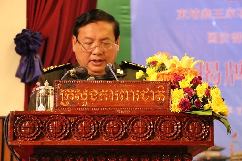 7月12日上午,柬埔寨王家研究院孔子学院柬埔寨国防部汉语中心揭牌仪式在柬埔寨国防部大礼堂隆重举行。柬埔寨国防部副部长晋翁上将(CHEANG Am)、中国驻柬埔寨大使馆武官李宁亚、柬埔寨孔子学院院长谢莫尼勒(H.E.CHEA Munyrith)、中方院长夏修龙及柬埔寨国防部有关官员150余人出席揭牌仪式。