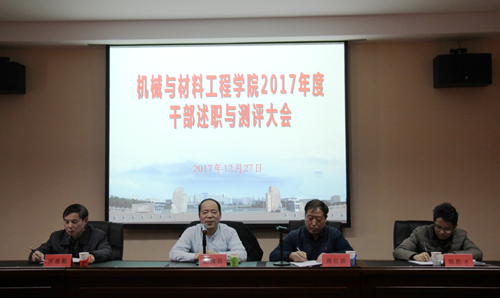 12月27日下午,机械与材料工程学院在机械实验楼会议室举行处级领导干部2017年度述职与测评大会。纪岗昌副校长,学校离退休职工管理处处长兼组织人事部副部长燕红波出席了会议,组织人事部张超老师参加了此次测评工作。会议由燕红波处长主持。机材学院领导及全体教职工参加了会议。