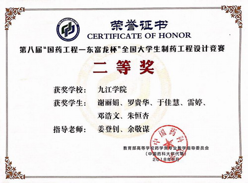该项竞赛是目前全国制药工程专业影响力最大的设计类竞赛。本届大赛的参赛题目是“口服固体制剂车间设计”,全国共计133所高校279支队伍报名参赛。大赛采取队伍限制原则,每个学校最多提交三份有效作品,并设立了全国一等奖12项、二等奖72项、三等奖84项。我校药生学院连续第二年参赛,并取得佳绩后,获全国二等奖、三等奖各一项。
