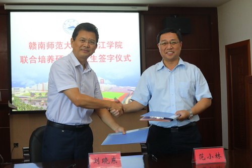 8月29日上午,赣南师范大学与九江学院联合培养硕士研究生签字仪式在我校行政楼党委会议室举行,赣南师范大学校长范小林、副校长罗序中,我校校长刘晓东、副校长王万山、副校长陈春生出席仪式,两校相关部门负责人参加了仪式。