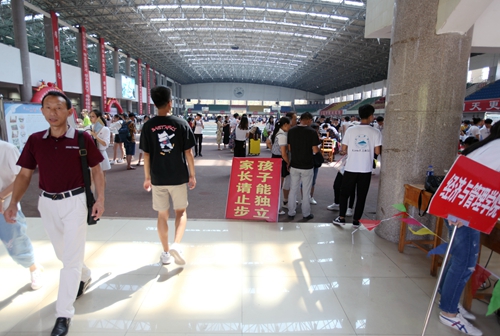 田径馆门外热闹非凡,场馆内更是人声鼎沸。早已做好充分准备的校迎新现场各部门和各二级学院的老师与同学热情地接待了每一位经历了舟车劳顿的新生们。