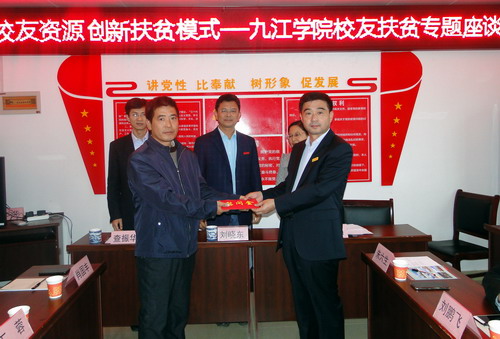 会上还举行了捐赠仪式。校友代表、芜湖市精准传动系统研究院有限公司总经理朱六生向东山村村委会主任雷云财递交了校友扶贫款。