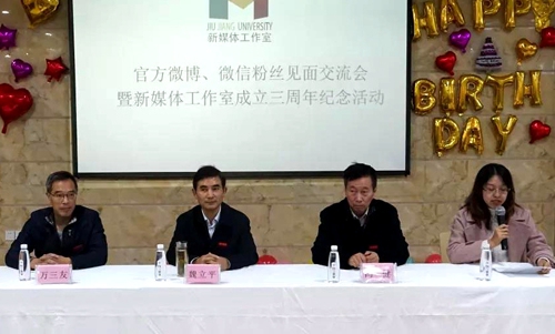 11月11日下午,九江学院官方微博、微信粉丝见面交流会暨新媒体工作室成立三周年纪念活动在我校主校区教工食堂二楼成功举办,校党委副书记魏立平,校党委委员、党委宣传部部长冯健,党委宣传部副部长万三友出席活动。九江学院官方微博、微信粉丝代表及新媒体工作室全体同学参加了本次活动。本次活动由新媒体工作室指导老师高原主持。