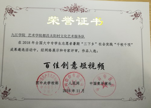“千校千项”的活动由团中央学校部与人民网、中国青年报社合作开展活动,旨在为进一步总结实践成果,扩大活动影响,引领广大青年学生建功新时代。活动历经材料申报、网络展示、公众投票、专家评审等环节,既对优秀成果进行展示与交流,又向全社会宣传了广大学生积极投身社会实践、开展基层服务的向上精神。其中艺术学院“暑期三下乡”都昌太阳村文化艺术服务队荣获全国“千城千项”“百佳创意短视频”。