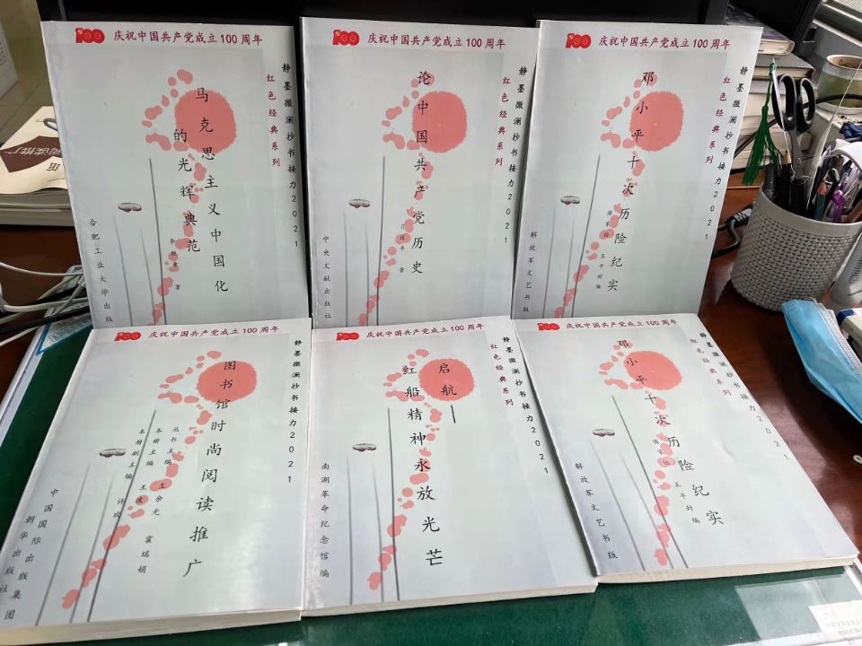 图书馆针对大学生成长阶段特点,以培育社会主义核心价值观、培育家国情怀,培养青年学生责任担当为目标,充分发挥第二课堂作用,通过策划组织阅读推广活动,有效进行理想信念教育,进一步弘扬中华优秀传统文化、革命文化、社会主义先进文化,助力校园思政建设。2021年党史学习教育期间,图书馆组织开展了“静墨微澜·红色经典”抄书接力活动,精心遴选《中国共产党简史》《中国共产党历史简明读本》《建国大业》《建党伟业》《建军大业》等馆藏红色经典书籍,专门开辟了优雅宁静的抄书场地,提供抄书本和笔具,供我校师生读者抄写。据统计,仅短短一个月内,累计入馆抄书的师生已达102人次,组团抄书的队伍已有7个,人数达200多人。管理学院会计A2022班吴鸿博同学说:“身为共青团员,抄写红色书籍,给党献礼,意义非凡。我们可以在抄书中学习先烈的革命精神,更加深刻地体会美好生活的来之不易,培养我们的爱国精神。”